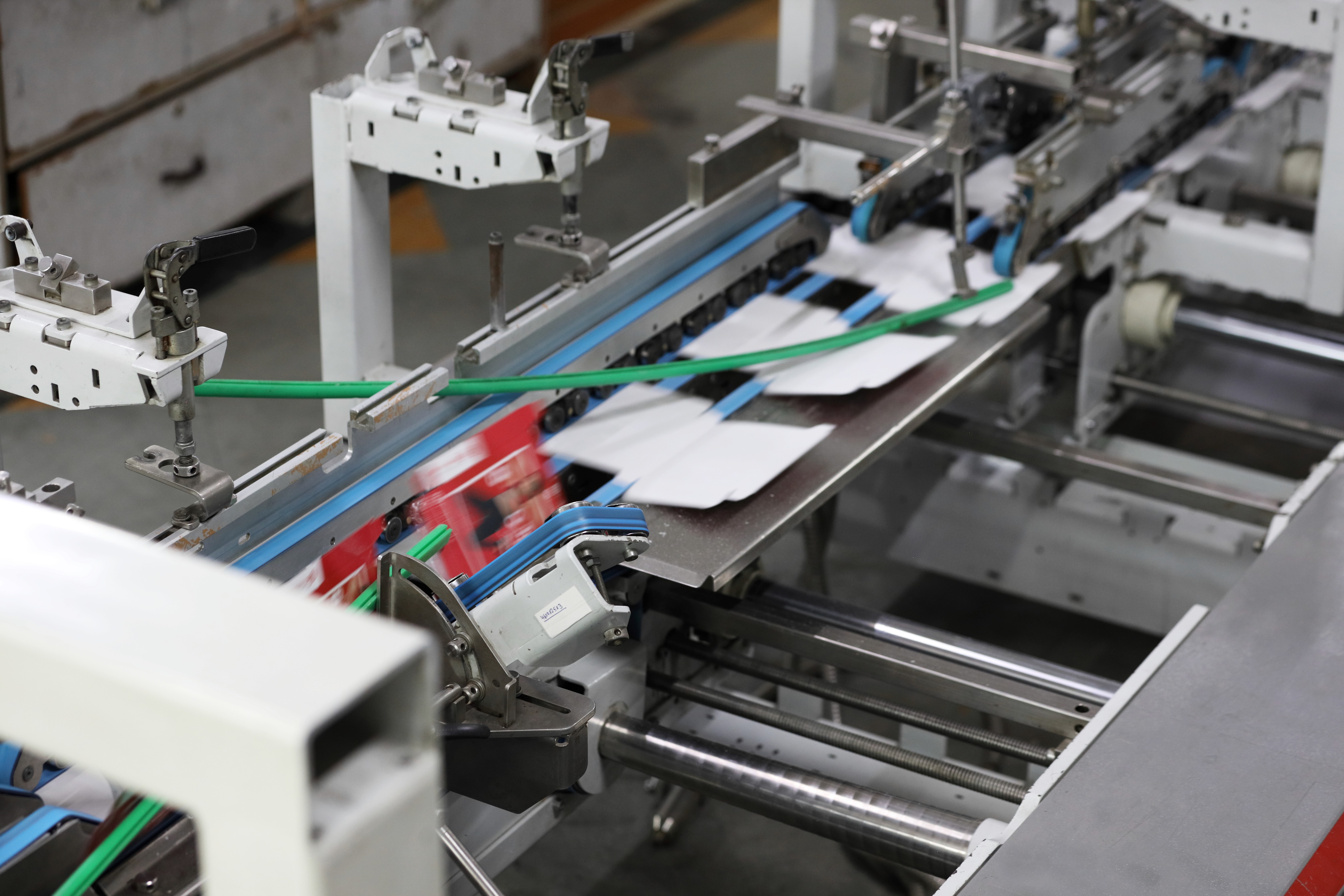 Emmeci lines from Italy — the global benchmark for automated luxury box making. Crisp 90-degree corners, consistent wrap tension, and structural uniformity at scale.